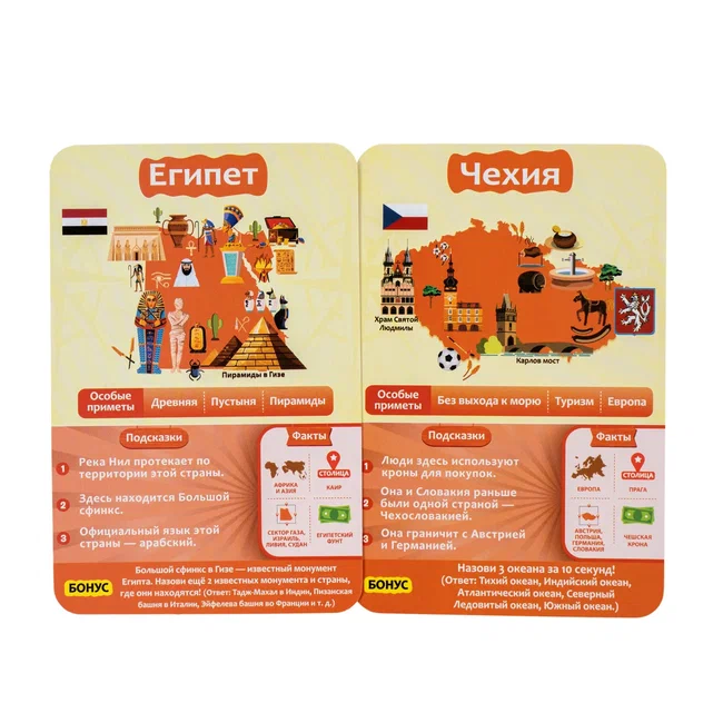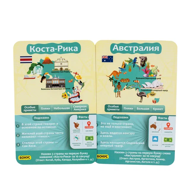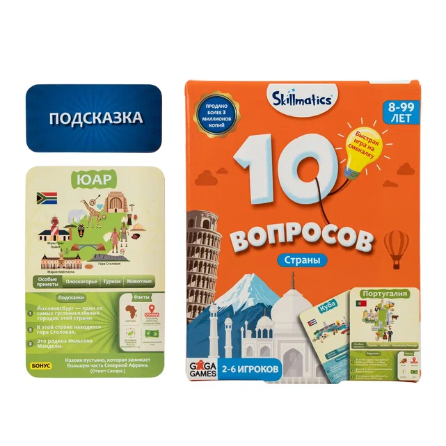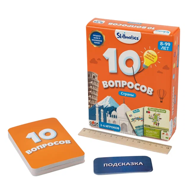 10 Вопросов: Страны — это самая взрослая и сложная часть серии познавательных игр, в которой участники с помощью двух особых примет и десяти наводящих вопросов пытаются отгадывать страны мира. Эта версия игры способна бросить вызов даже взрослым, не говоря уже о детях — настоящая проверка на эрудицию и знания географии. Вот вы знали, что столица Кении на языке масаев означает «прохладные воды», а Иран раньше назывался Персией?