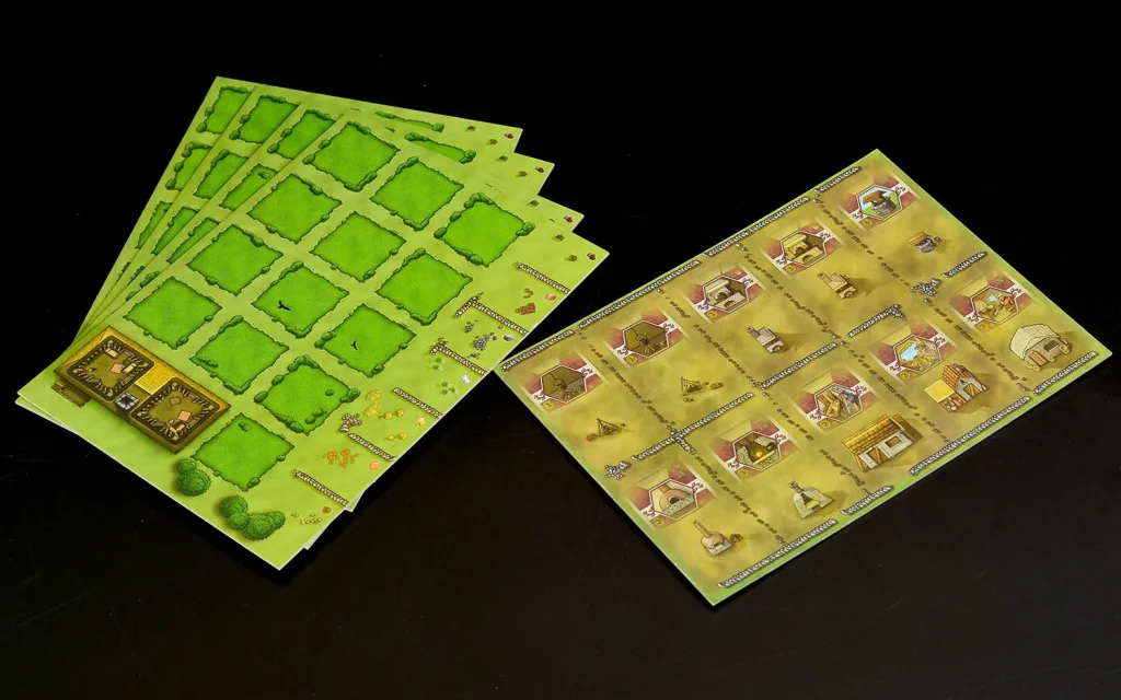 Компонентов в коробке действительно много: более 270 деревянных фишек, отдельные ресурсы, животные, заборы, жетон первого игрока и прочие элементы, благодаря которым ферма выглядит объёмно и живо. Составной планшет поля, дополнительные расширения, планшет улучшений и четыре планшета ферм с уникальным оформлением помогают удобно разложить игру и сохранить читаемость происходящего даже при большом количестве элементов на столе. Внутри коробки предусмотрен продуманный органайзер: контейнер для карт с разделителями, отдельные коробочки под ресурсы и фишки, что заметно ускоряет подготовку к партии и сбор игры после.