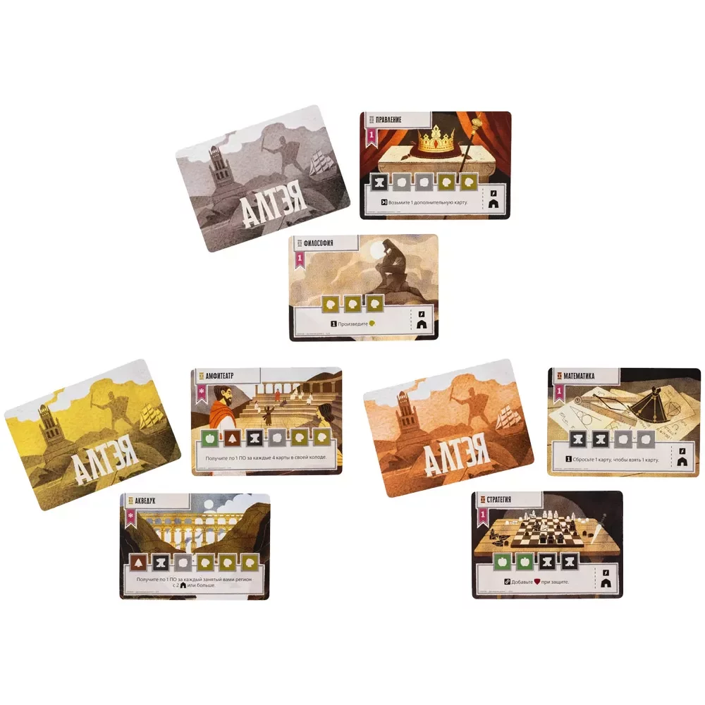 Ключевая механика Алтэи — колодострой. В начале у каждого игрока простая стартовая колода, но со временем вы покупаете новые карты на общем рынке, усиливая свой движок. Карты дают ресурсы (дерево, камень, еду, металл, культуру), военную силу, дополнительные действия и эффекты, влияющие на битвы, развитие и экономику. Важно не только брать сильные карты, но и следить за «мусором» в колоде: лишние, слабо взаимодействующие карты снижают эффективность и мешают выстроить стройную стратегию.
