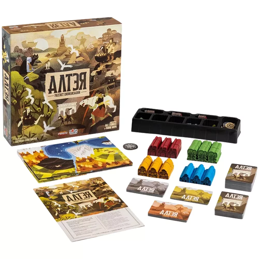Игровое поле представляет собой карту Алтэи, разделённую на регионы с разным ландшафтом и ресурсами. Вы будете размещать на них деревянные поселения — деревни, малые и большие города — чтобы получать контроль, доход и новые возможности. Конфликта в игре много: в любой момент можно начать битву за соседний регион, вытесняя соперника и забирая его домики в качестве трофеев. Однако прямая агрессия — не единственный путь: можно делать ставку на развитие технологий, строительство чудес и аккуратное расширение без постоянных войн.