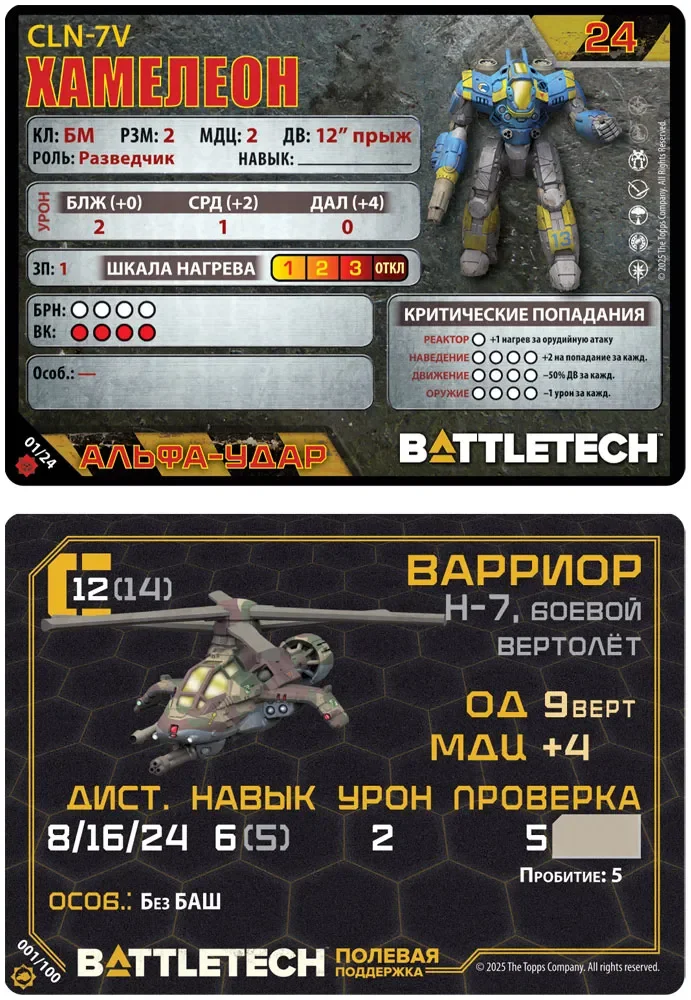 Набор также включает 16‑страничную брошюру с карточками мехов, 8 двусторонних карточек пилотов и 12 двусторонних карточек «Альфа‑удара». Эти компоненты упрощают использование дополнения как в классическом BattleTech, так и в упрощённом режиме Alpha Strike: характеристики всегда под рукой, а пилоты добавляют отряду индивидуальность. Помимо игровых материалов, вы найдёте 16‑страничный обзор вселенной с историей наёмников и 32‑страничный рассказ, помогающие глубже погрузиться в антураж мира.