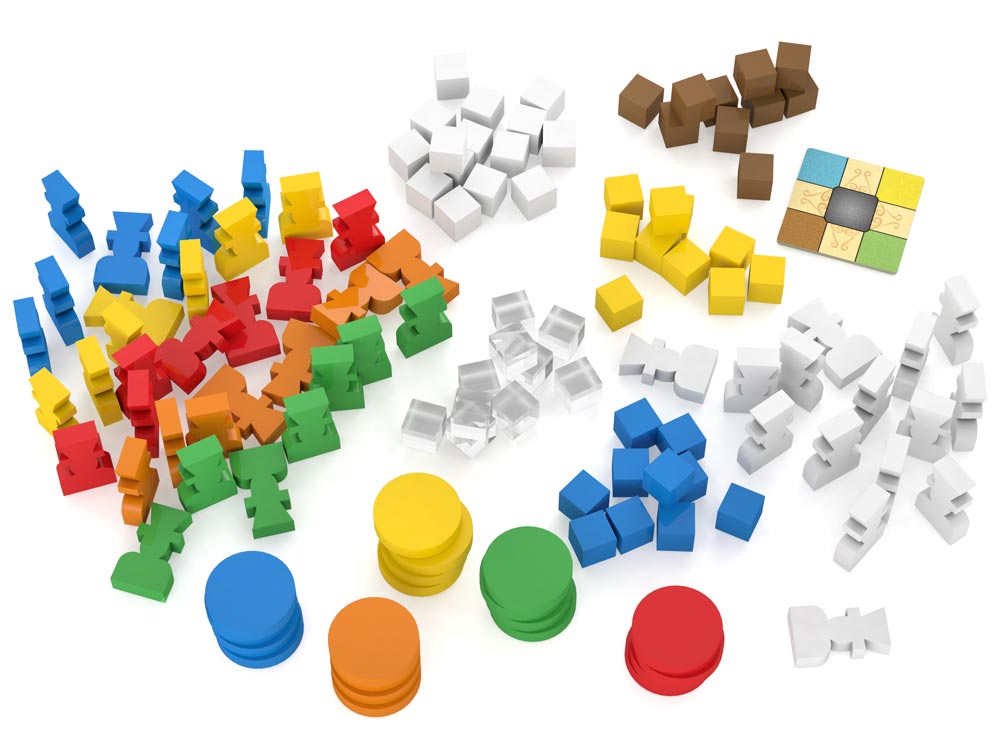 • 20 деревянных дисков, 39 деревянных фишек, 45 деревянных кубиков, 10 пластиковых кубиков