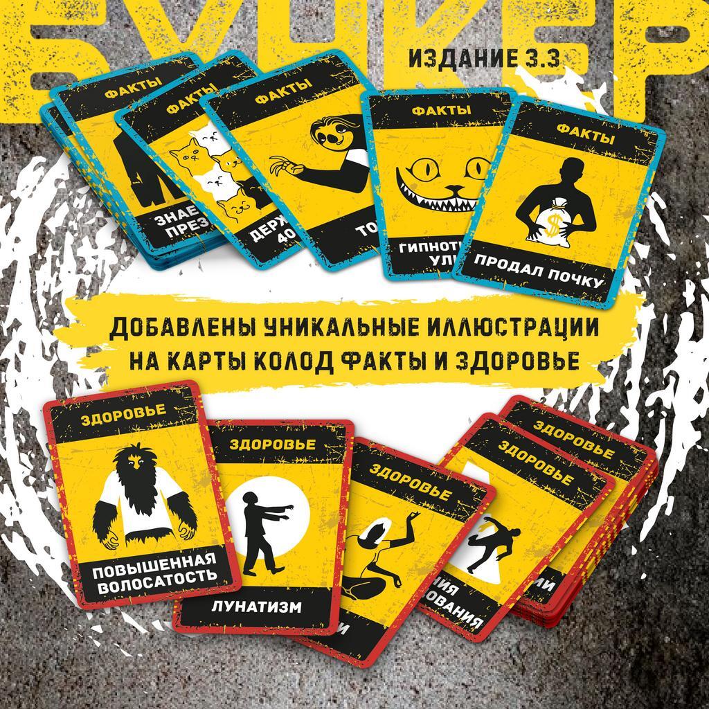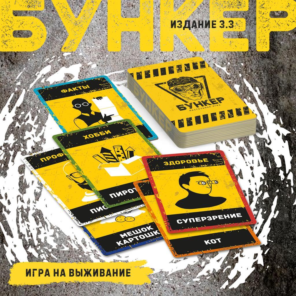 Особенность издания «Бункер» 3.3 – это обновлённые, иллюстрированные колоды и актуальные карты. В этой версии присутствуют уникальные иллюстрации на всех картах «Багаж», «Хобби», «Факты» и «Здоровье», что делает набор персонажей более наглядным и атмосферным. В комплект также входит карта «Кода доступа», а часть карт была переработана по сравнению с предыдущими версиями, что освежает партии и добавляет вариативности.