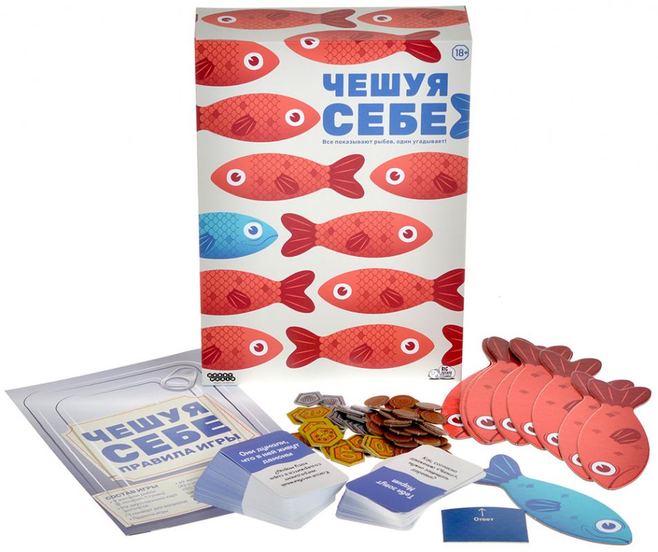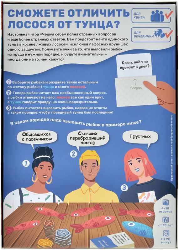 Настольная игра “Чешуя себе” полна странных вопросов и ещё более странных ответов. Вам предстоит найти одинокого тунца в косяке лживых лососей, исключив пафосных врунишек одного за другим. Получайте очки за то, что выловили рыбок из пруда в нужном порядке, и будьте внимательны – иногда они не то, чем кажутся!
