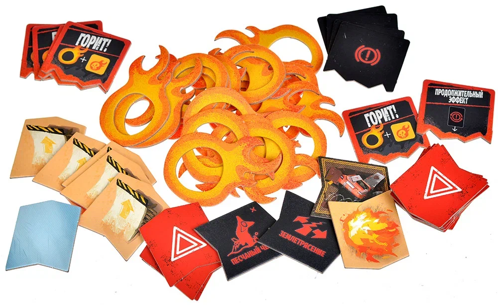 Особая тема дополнения — огонь. В составе вы найдёте 20 жетонов «Горит!» и специальный кубик огня. Пламя становится одним из главных символов «Дьявольской мясорубки», превращая отдельные участки трассы в настоящие зоны ада. Огонь может распространяться, создавая новые опасные локации, или усиливать уже существующие угрозы. Кубик огня отвечает за случайный характер этого процесса: никто не знает заранее, где именно пламя разгорится сильнее, а где ослабнет. Это усиливает ощущение хаоса и заставляет игроков принимать рискованные решения, рассчитывая, удастся ли проскочить через огненный участок вовремя.​