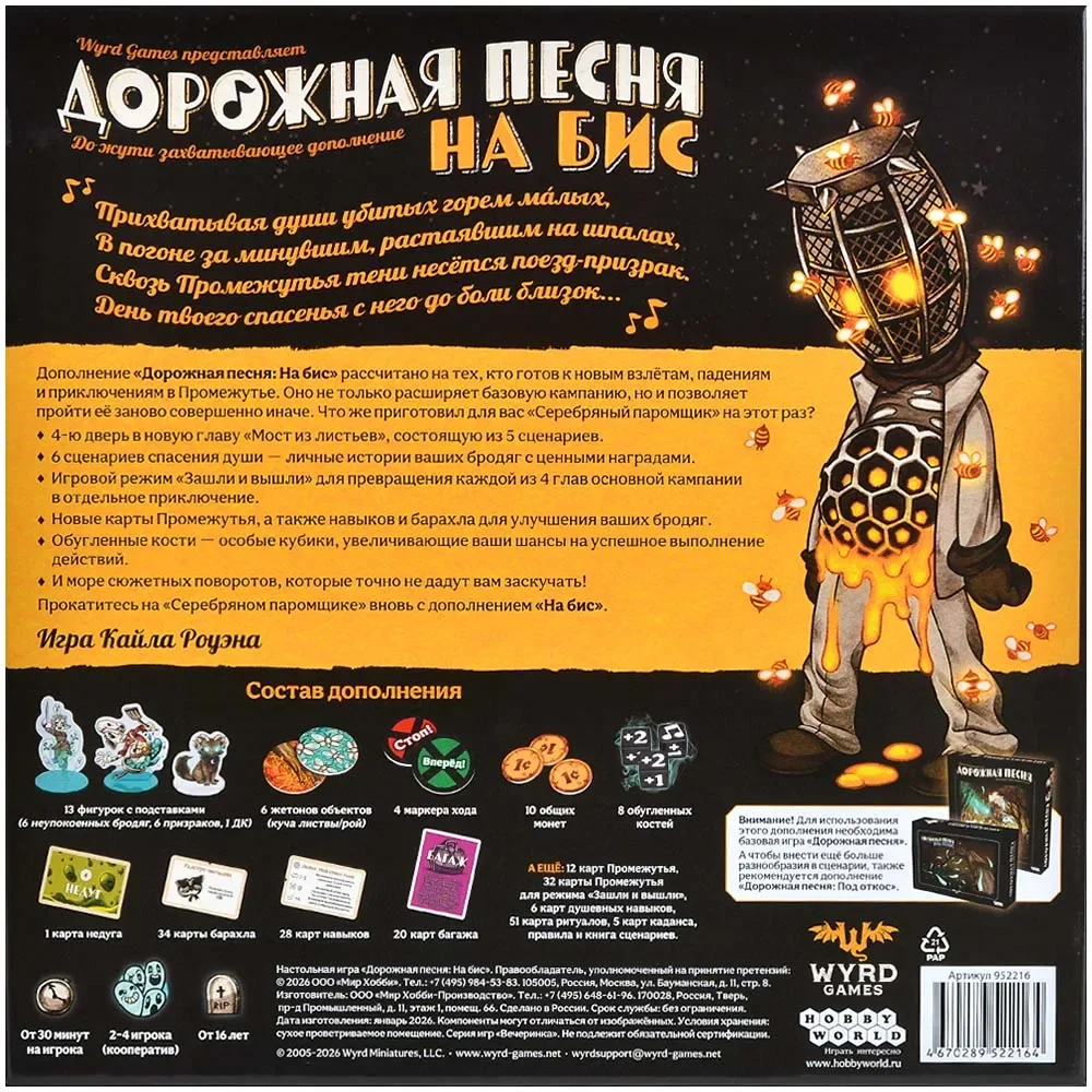 «Дорожная песня: На бис» — крупное дополнение к мрачной кооперативной игре «Дорожная песня», которое позволяет прожить путешествие по Промежутью заново, но с другим смыслом и другой судьбой. Легендарный поезд‑призрак «Серебряный паромщик» вновь собирает скорбные души, и теперь у бродяг появляется ещё один шанс на спасение — или новое падение в бездну отчаяния. Дополнение раскрывает новую полноценную главу кампании «Мост из листьев» и добавляет целый набор модулей, меняющих правила и структуру уже знакомых сценариев.