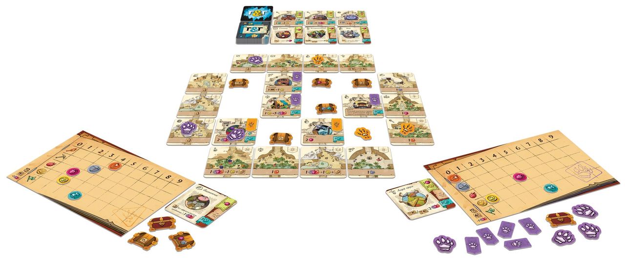 Игровое поле формируется из рамки карт входов, внутрь которой помещаются жетоны сундуков. Такое построение делает раскладку партии динамичной: порядок карт и расположение сокровищ меняется от игры к игре, сохраняя ощущение новых раскопок. Сами карты входа служат и источником ресурсов, и стартовыми точками маршрутов вглубь гробницы, поэтому решения по их выбору всегда многослойны: нужно учитывать и немедленную выгоду, и долгосрочную позицию.​