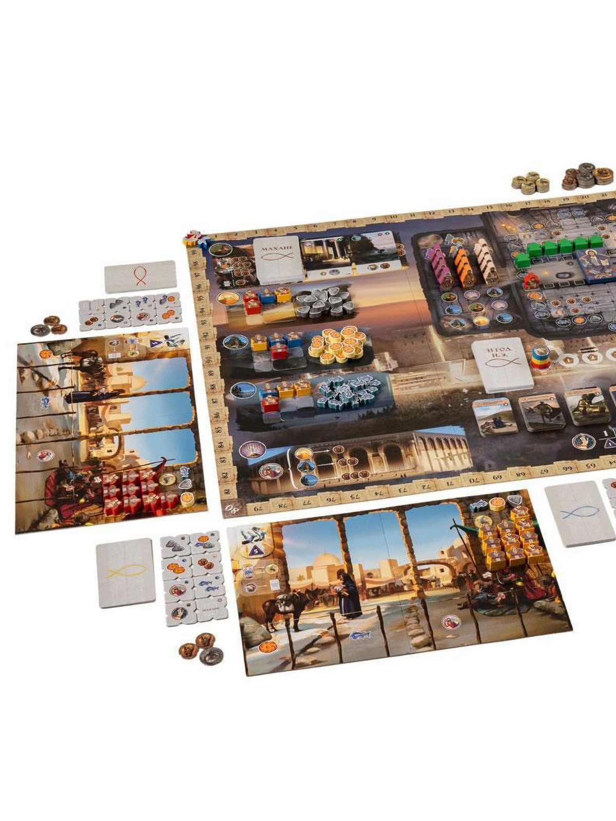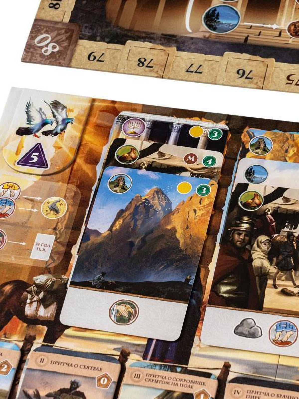 Во второй части хода включаются сами последователи. Они могут слушать притчи, вновь посещать храм или рынок, совершать благодеяния другим игрокам или отправляться напрямую к Тайной вечере. Важная фишка игры — разыгранные карты не уходят в сброс, а остаются на планшете, формируя постоянный «движок» действий. Это тот самый «колодострой без колодостроя»: вы не тасуете колоду, а строите цепочки эффектов прямо на столе, и порядок выкладки карт приобретает критическое значение. Собрав удачную комбинацию, вы сможете посещать двенадцать апостолов, усаживать их за общий стол и получать мощные награды.