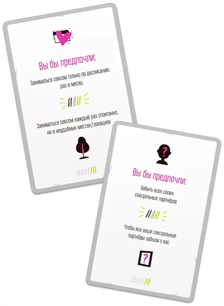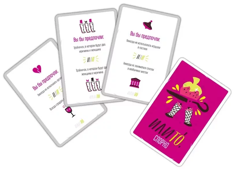 По сути, «ИлиТо Спорно» — это смесь карточной игры и откровенной беседы. Каждая карта предлагает непростой выбор из двух неприятных, странных или просто очень интимных вариантов. Игрокам приходится решать, какое «меньшее зло» они предпочли бы, а главное — объяснить свой выбор так, чтобы убедить ведущего. Правильных ответов здесь не существует: важно лишь, насколько ярко и убедительно вы аргументируете свою позицию.