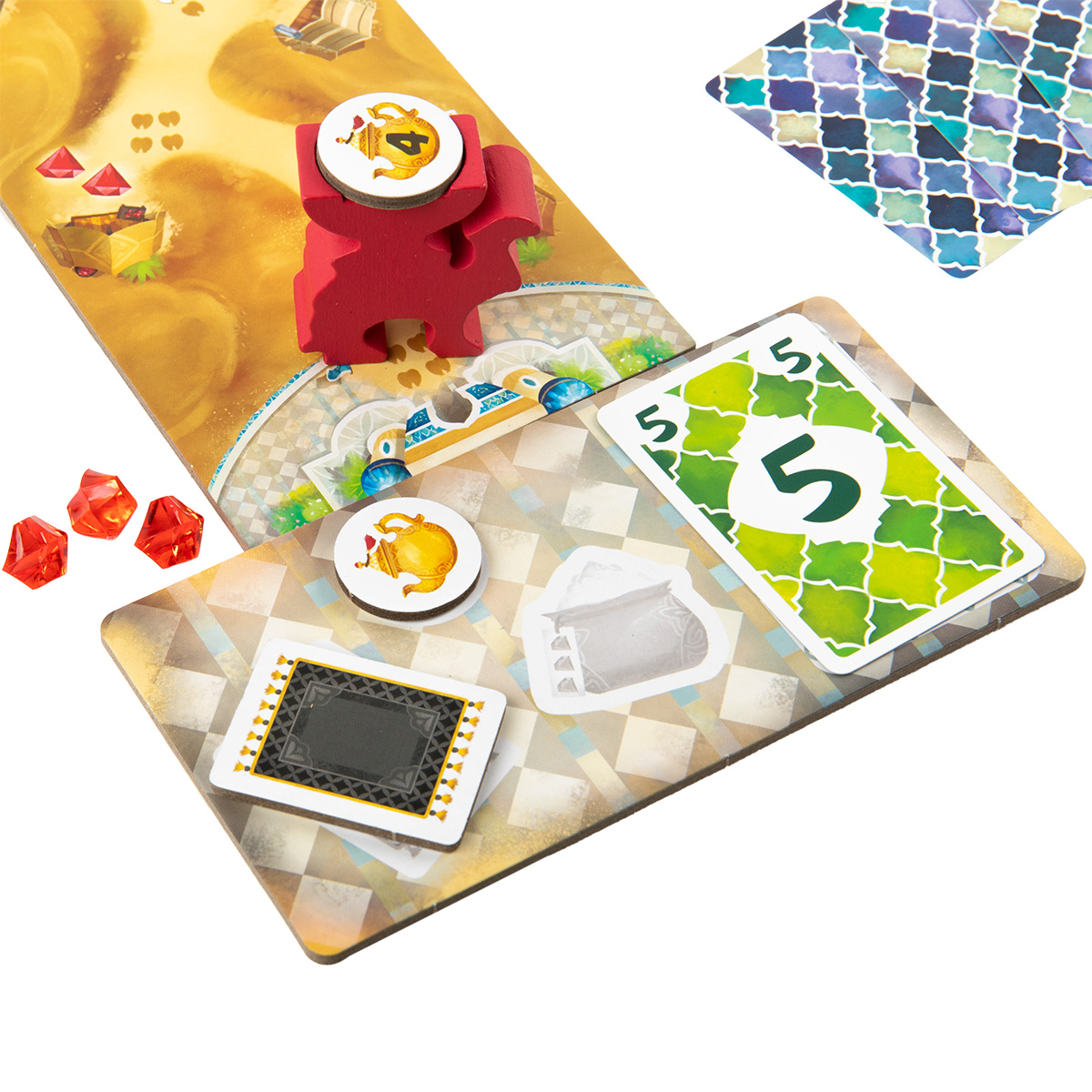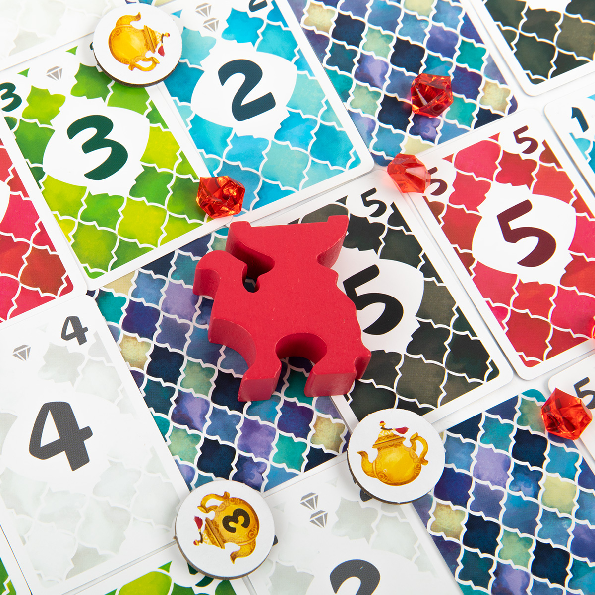 Ключевой элемент механики – своеобразное «перетягивание каната» верблюдами. Цвет карты определяет, какой верблюд двинется, а число на карте – сколько шагов он сделает по треку. Если несколько игроков сыграли карты одного цвета, верблюд идёт к тому, кто разыграл карту с меньшим номиналом, а остальные получают небольшую компенсацию в виде одного драгоценного камня. Это создаёт непростой выбор: вы либо гарантируете себе движение каравана, рискуя потерять часть выгоды, либо ставите на более высокое значение и надеетесь хотя бы на компенсацию.