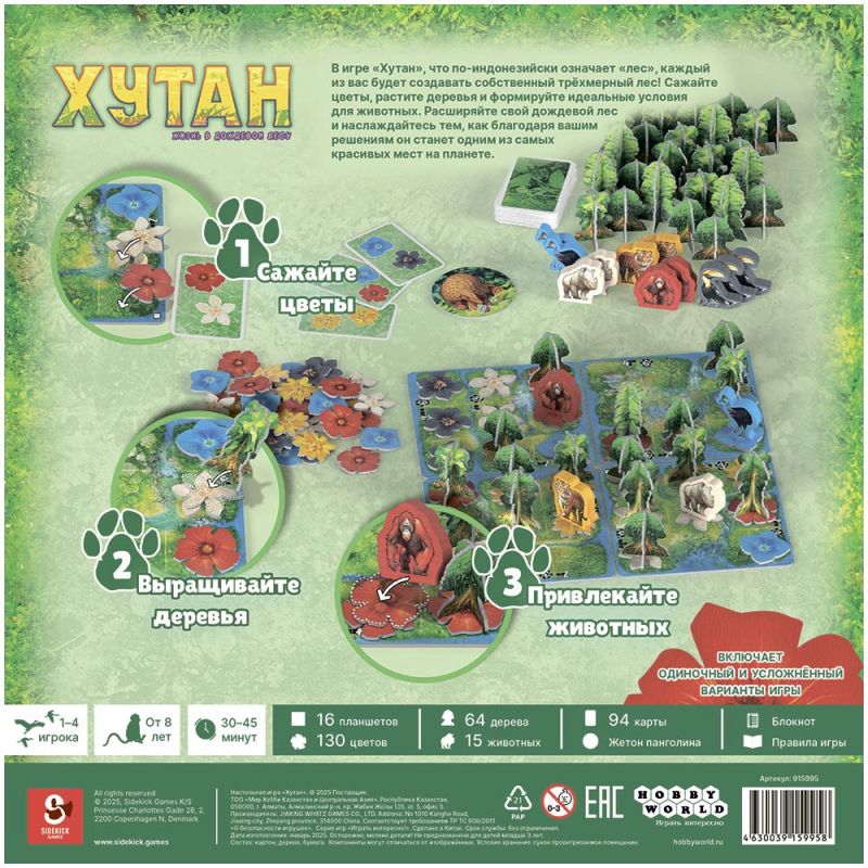 «Хутан» (что в переводе с индонезийского означает «лес») предлагает игрокам создать собственный трёхмерный тропический лес и увидеть, как он оживает прямо на игровом столе. В роли заботливых хранителей природы вы будете высаживать цветы, выращивать деревья и привлекать в свои владения животных, стараясь сформировать идеальные условия для жизни в джунглях. Каждое принятое решение влияет на то, насколько гармоничным и процветающим станет ваш участок леса к концу партии.