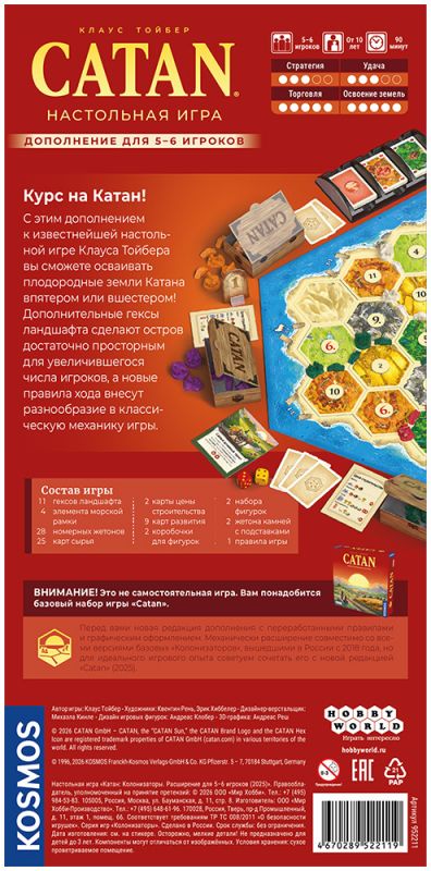 Это дополнение к «Catan: Колонизаторы» позволяет развернуть классическую партию не вчетвером, а сразу впятером или вшестером, не теряя при этом фирменного темпа и напряжения борьбы за ресурсы. В коробке вы найдёте дополнительные гексы ландшафтов, жетоны чисел и полный комплект фигурок для двух новых игроков, так что остров Катана становится больше, а конкуренция за лучшие места — ещё ожесточённее. Одновременно с этим обновлённое издание предлагает переработанные правила хода, которые ускоряют игру и помогают всем участникам оставаться вовлечёнными, даже если их ход ещё не скоро.