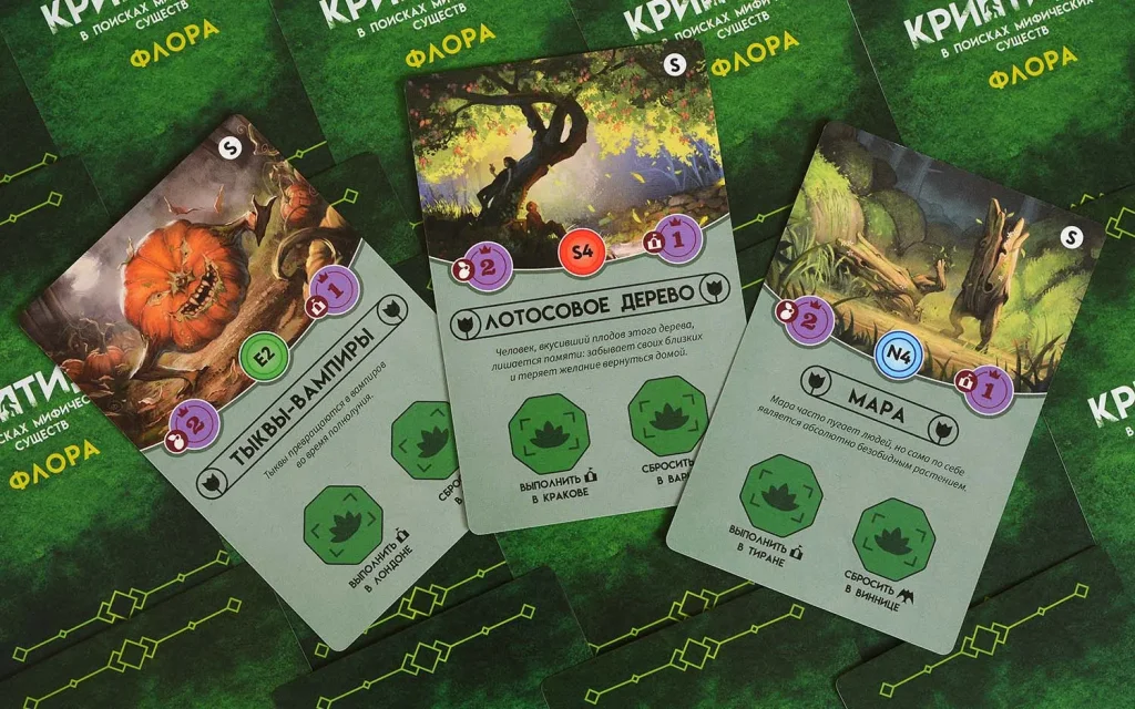 Дополнение вводит в игру новый пласт задач – карты растений и квесты, связанные с ними. Каждый экземпляр мифической флоры – это отдельная карта с описанием и специальным заданием, которое нужно выполнить, чтобы заполучить растение и его эффект. Темы квестов привязаны к уже знакомым механикам базы: вам могут понадобиться определённые типы доказательств, успехи в отслеживании криптидов, нужное расположение тайлов в заповеднике или выполнение конкретных контрактов. Таким образом, «Флора» аккуратно вплетается в существующую структуру партии, не ломая её, а добавляя новые цели и приоритеты.