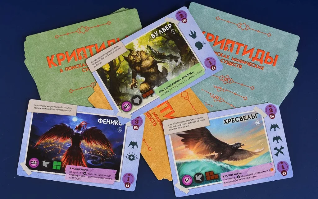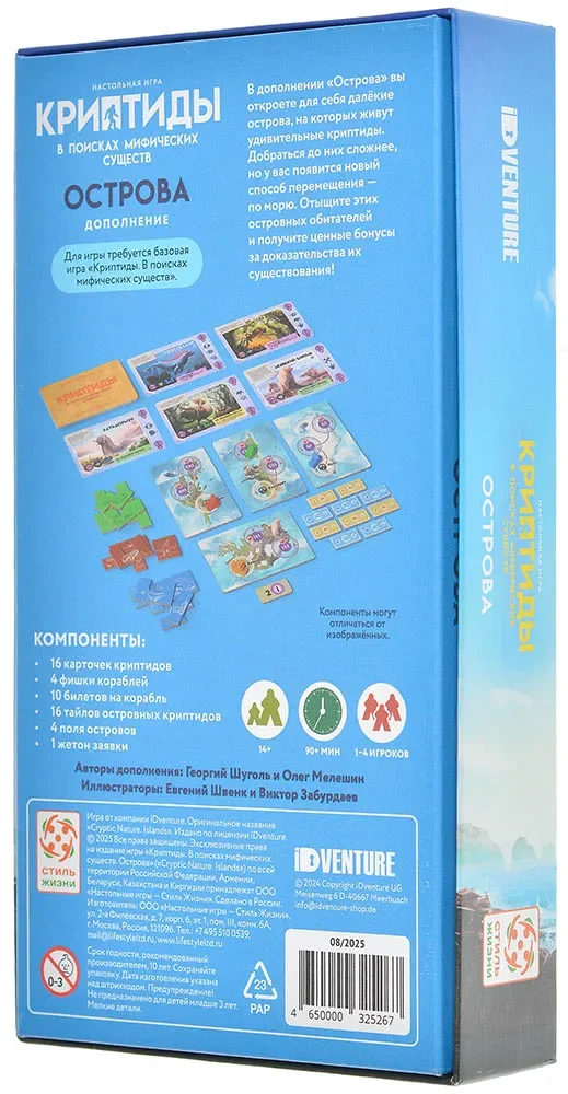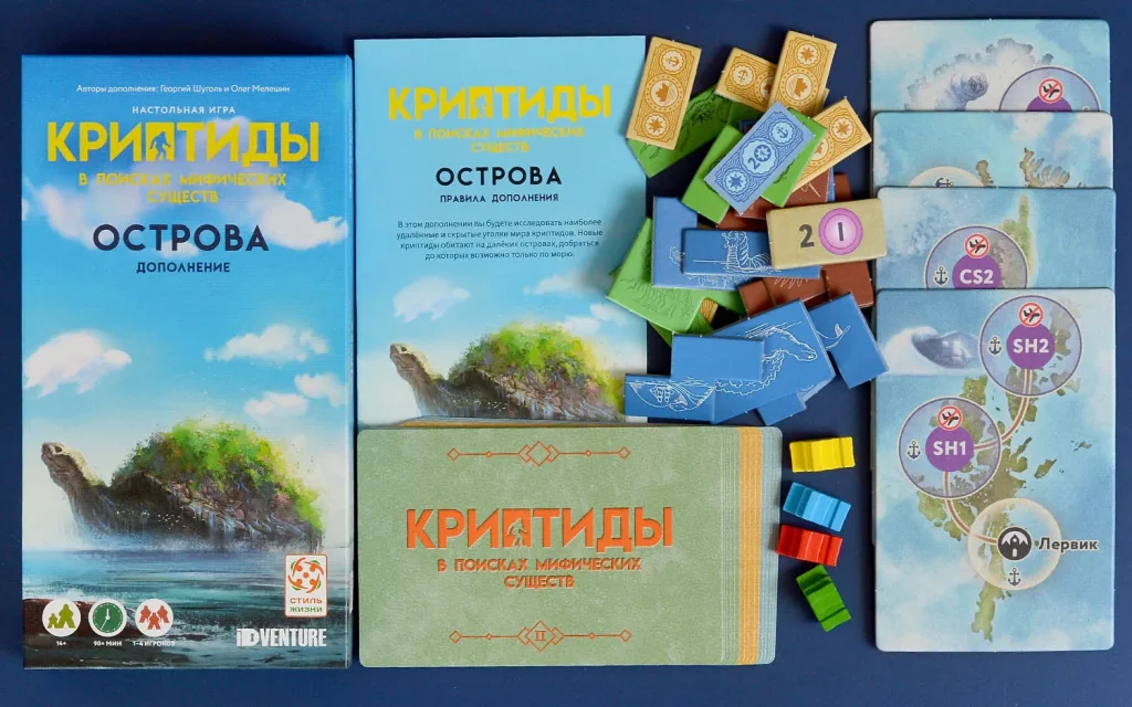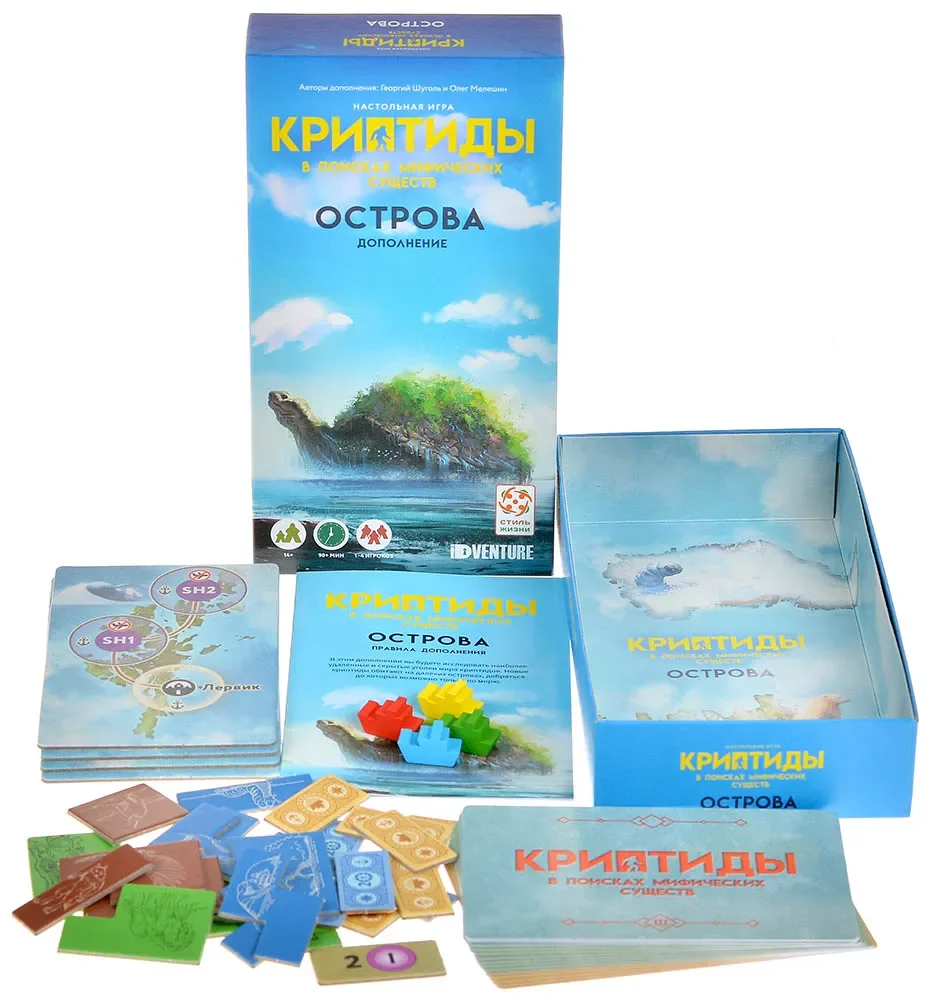 Важно: на странице прямо сказано, что продукт не является самостоятельным. Для использования дополнения нужна базовая версия «Криптиды: В поисках мифических существ», именно она содержит все базовые компоненты – игровое поле Европы, заповедник, основные карты криптидов и контрактов, жетоны ресурсов, фигурки криптозоологов и помощников. «Острова» привносят дополнительные карты, тайлы и фишки, которые встроены в уже существующую систему, а не заменяют её.