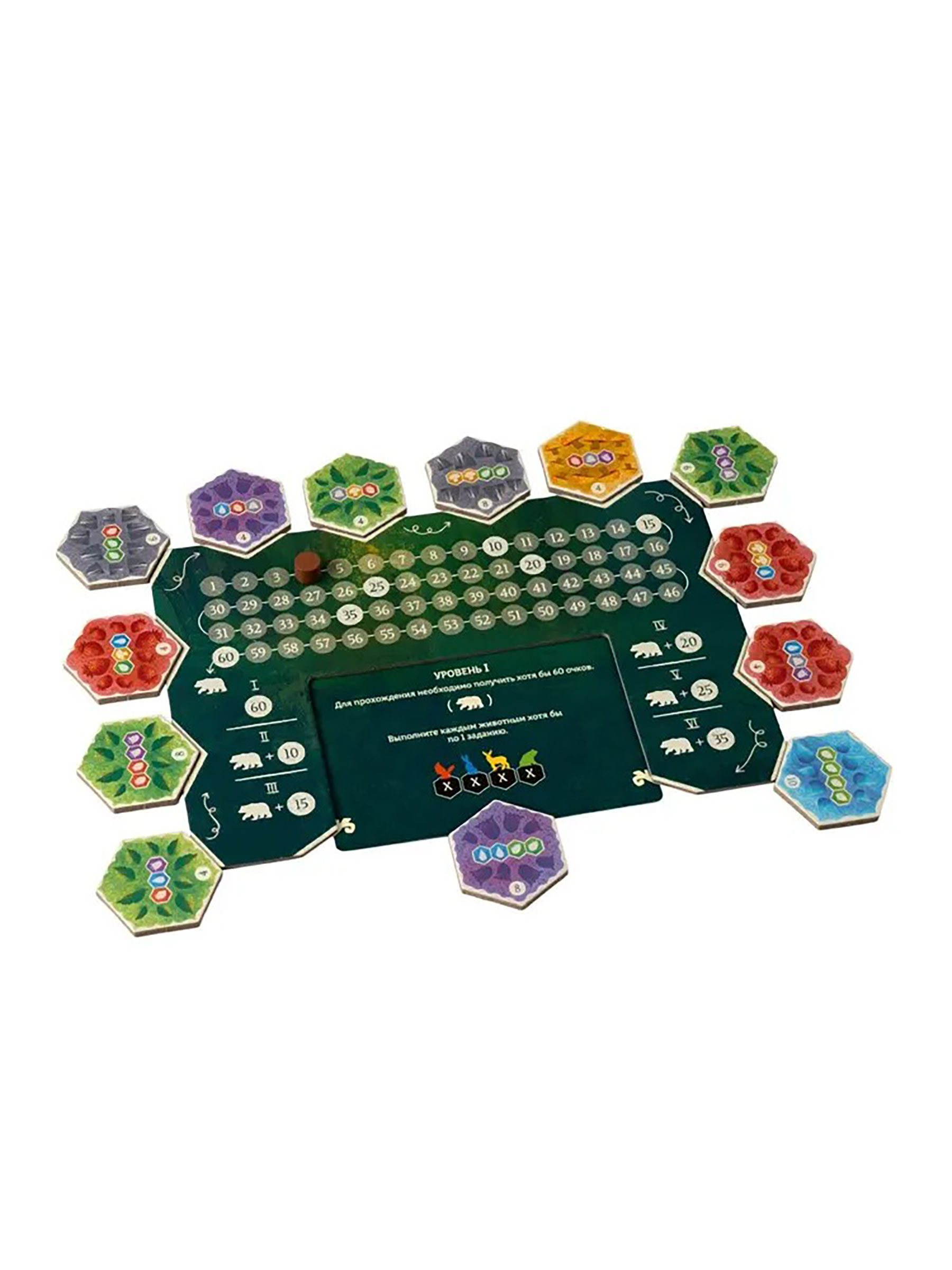 60 двухсторонних тайлов: одна сторона — тропы и ресурсы, другая — задания с условиями и очками