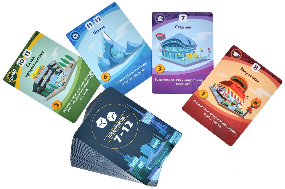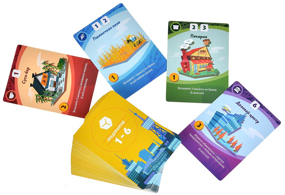 • Стартовая фаза (3 раунда): Игроки по очереди покупают одно предприятие без броска кубика