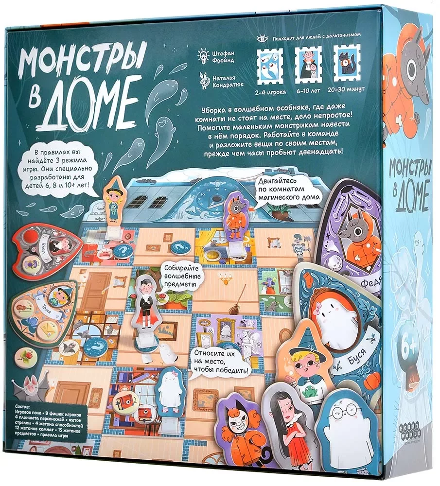 Красочное оформление и милый стиль иллюстраций делают игру визуально привлекательной и убирают «страшный» аспект монстров, превращая их в забавных помощников по дому. Каждый новый заход в особняк ощущается как небольшое приключение: комнаты меняются, предметы оказываются в неожиданных местах, а команда монстриков снова и снова пытается победить хаос до полуночи. «Монстры в доме» отлично подойдут как первая кооперативная настолка для детей и как тёплый семейный формат, в котором все не соперничают, а играют «за одну команду».