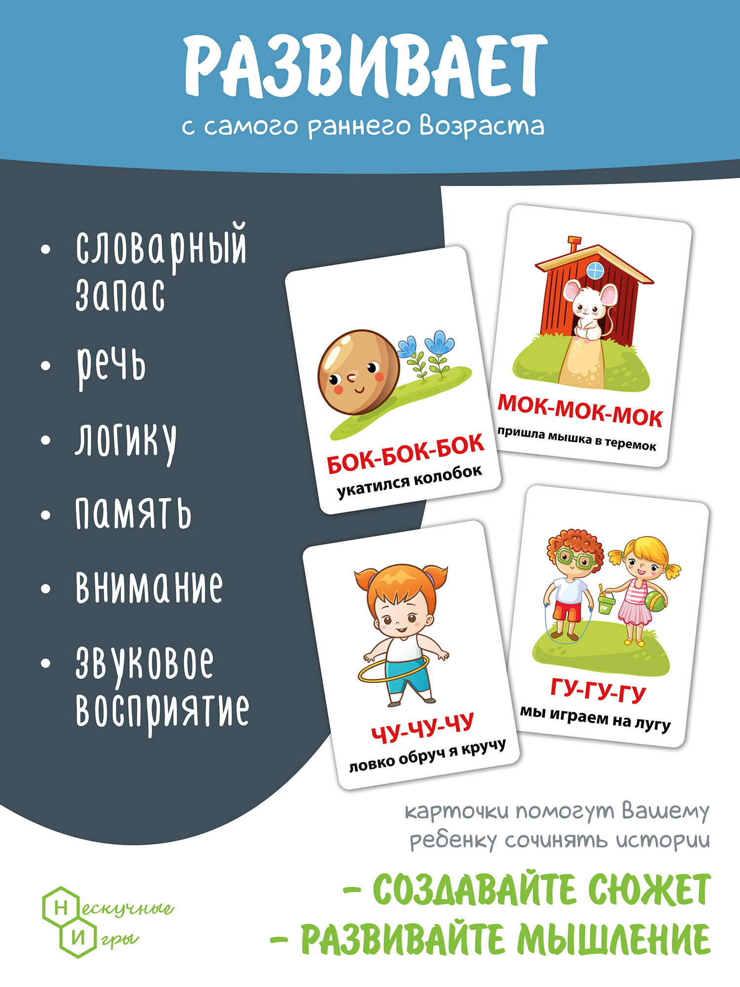 Вместе малышом возьмите несколько карточек и придумайте небольшую историю, как они могли бы взаимодействовать в жизни.