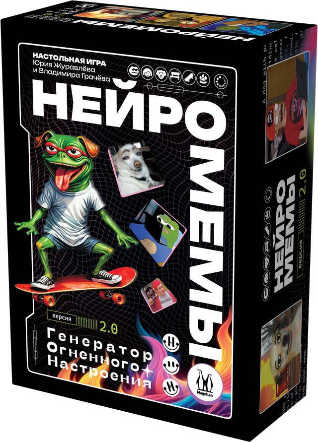 «Нейромемы 2.0. Генератор огненного настроения» — быстрая и задорная настольная игра для тех, кто живёт в мире мемов и интернет-культуры. Обновлённая нейросеть перемешала знакомые картинки, исковеркав классические шаблоны и создав странные, смешные и местами абсурдные нейромемы. Задача игроков — среди этого хаоса разглядеть знакомые образы, вспомнить исходники и быстрее соперников восстановить мемный порядок. Игра рассчитана на 3–6 участников, занимает около 15 минут и отлично подходит для шумных посиделок с друзьями или разогрева перед более долгими настолками.
