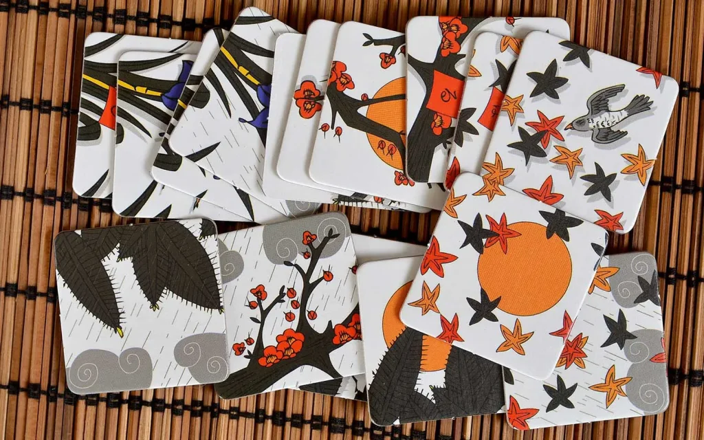 • 16 карт‑плиток сада – на каждой изображены два из восьми символов (сакуры, ирисы, клены, птицы и др.).