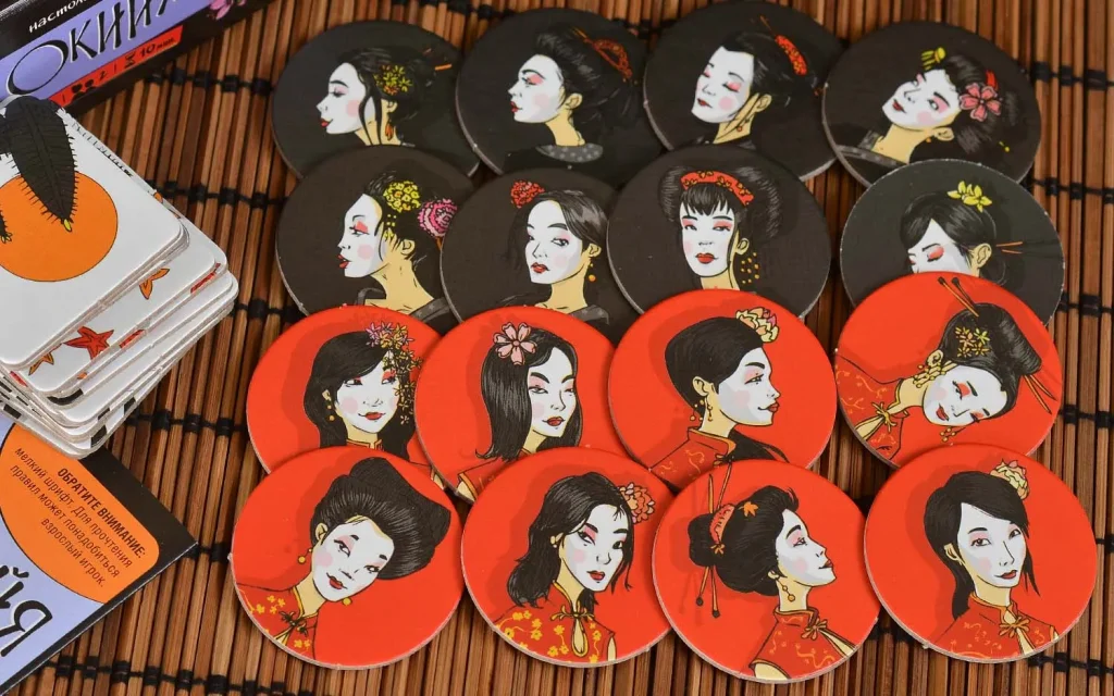 • 16 круглых жетонов гейш – по 8 фишек у каждого игрока (красные и чёрные)