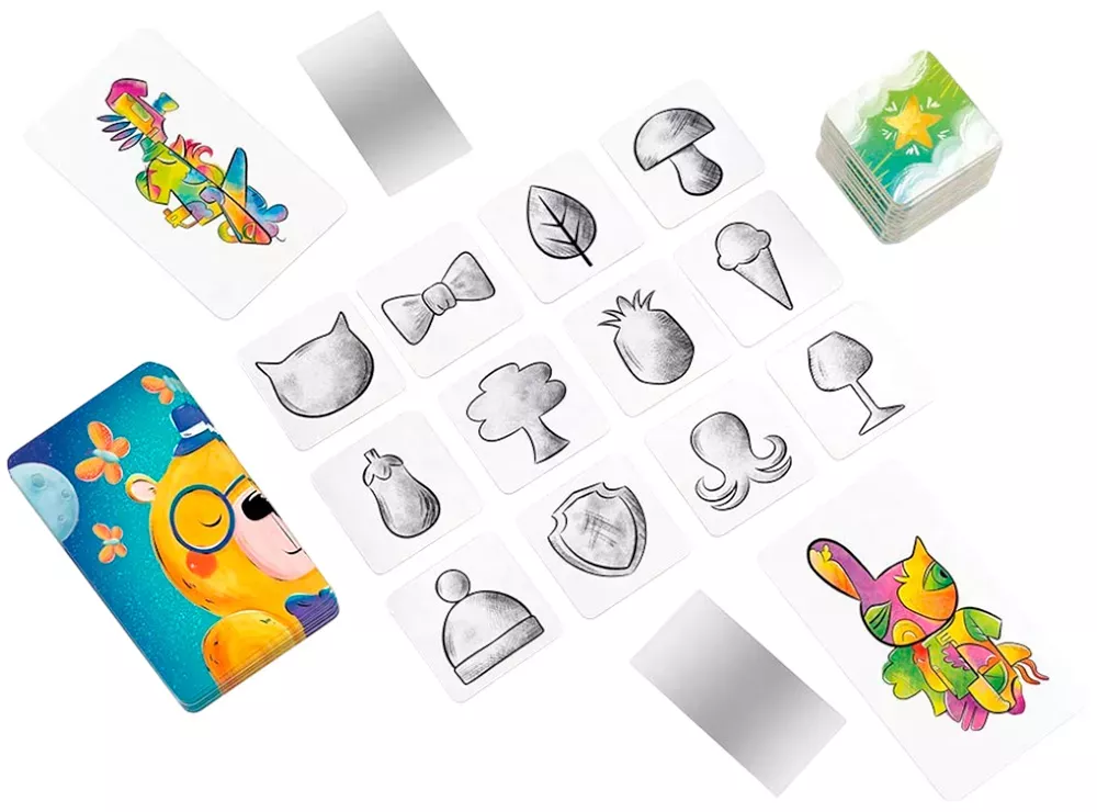 Зеркала (6 шт.) — специальные отражающие карточки, позволяющие «достроить» вторую половину рисунка и увидеть спрятанный объект.