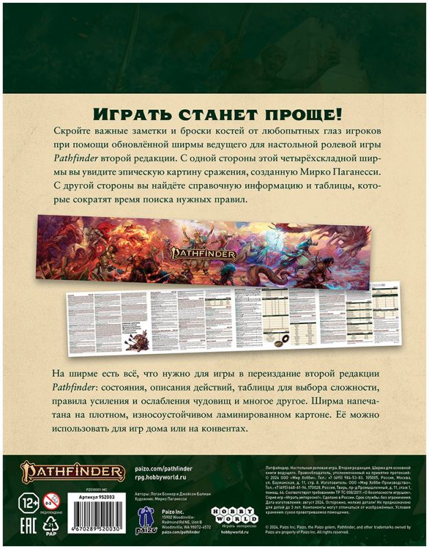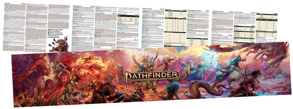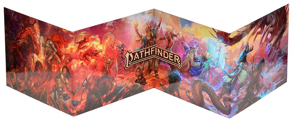Обновлённая ширма ведущего для Pathfinder второй редакции поможет скрыть секреты сюжета и результаты бросков от игроков. Эта четырёхсекционная ширма сочетает функциональность и эстетику: с лицевой стороны вас встретит эпичная иллюстрация битвы от художника Мирко Паганесси, а с внутренней — удобные справочные таблицы и правила, ускоряющие поиск ключевой информации.