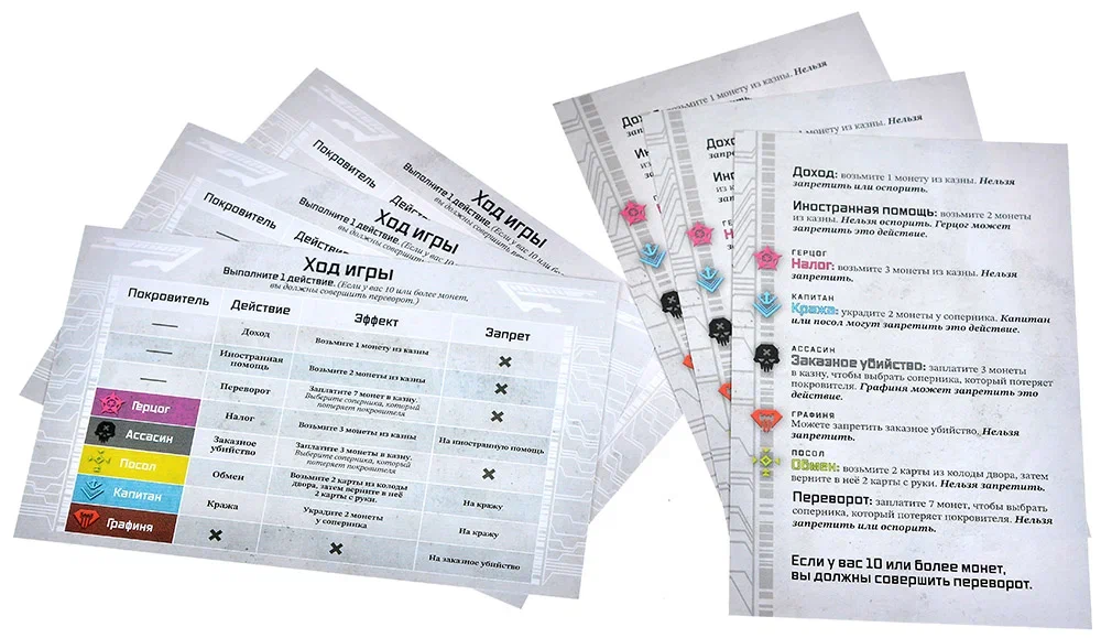 Варианты действий в «Перевороте» практически не ограничены ничем, кроме вашей фантазии и умения блефовать. Вы можете пользоваться возможностями своих реальных покровителей или приписывать себе чужие роли, чтобы получить нужный эффект: больше монет, убийство чужого персонажа, защиту от атаки или отмену чужого действия. Соперники могут вам поверить или бросить вызов. Если блеф раскрывается, вы теряете влияние, а если нет — жестоко наказываете того, кто решил усомниться в вашей честности.​