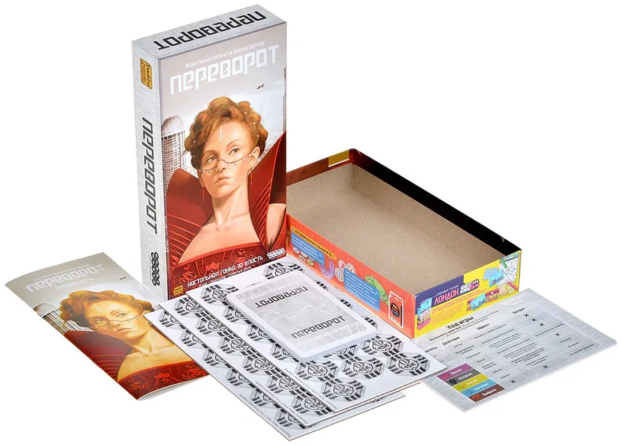 «Переворот» — динамичная настольная игра о власти, интригах и холодном расчёте, в которой каждый раунд решается за счёт удачного блефа и своевременного удара по соперникам. Действие разворачивается в недалёком будущем, где правительство ввергло людей в нищету и отчаяние. Большинство мечтает о политическом перевороте, но для вас это не трагедия, а удобный момент: именно на фоне хаоса вы стремитесь занять вершину власти и избавиться от всех конкурентов.​