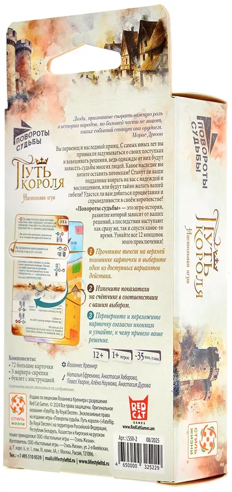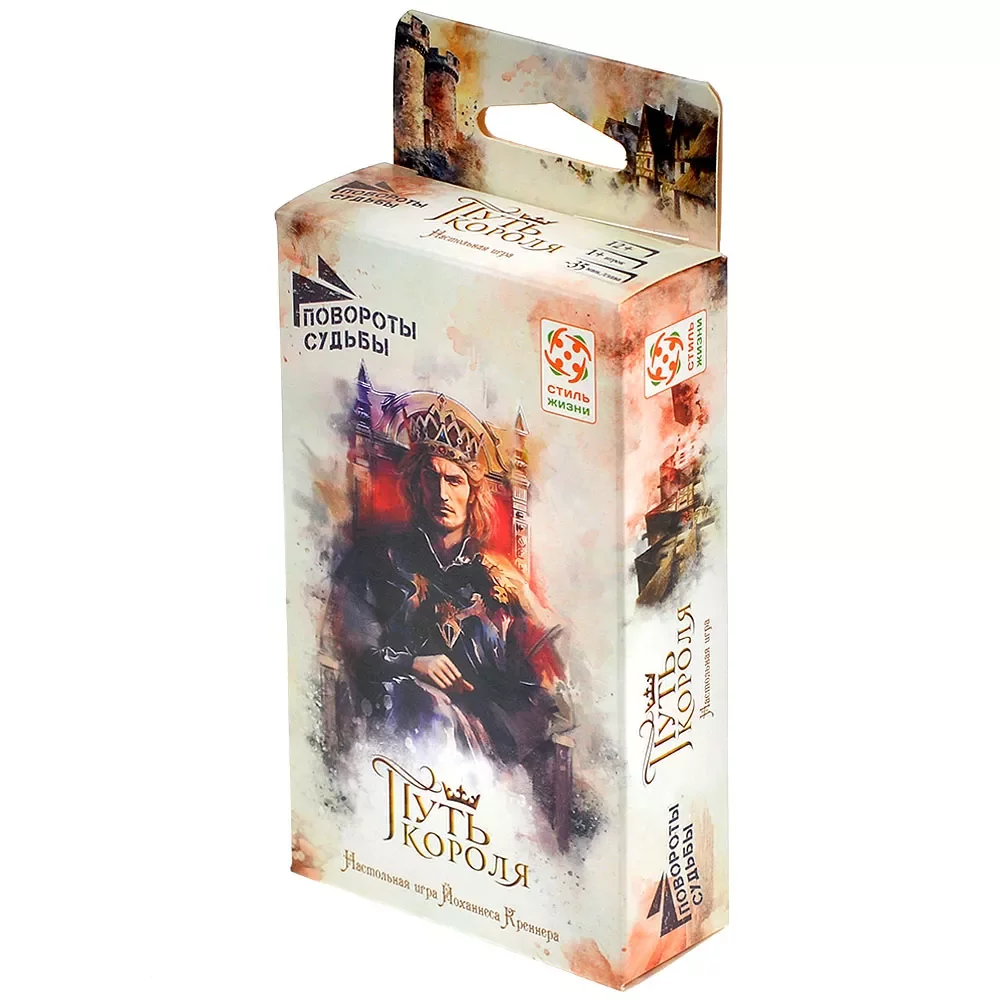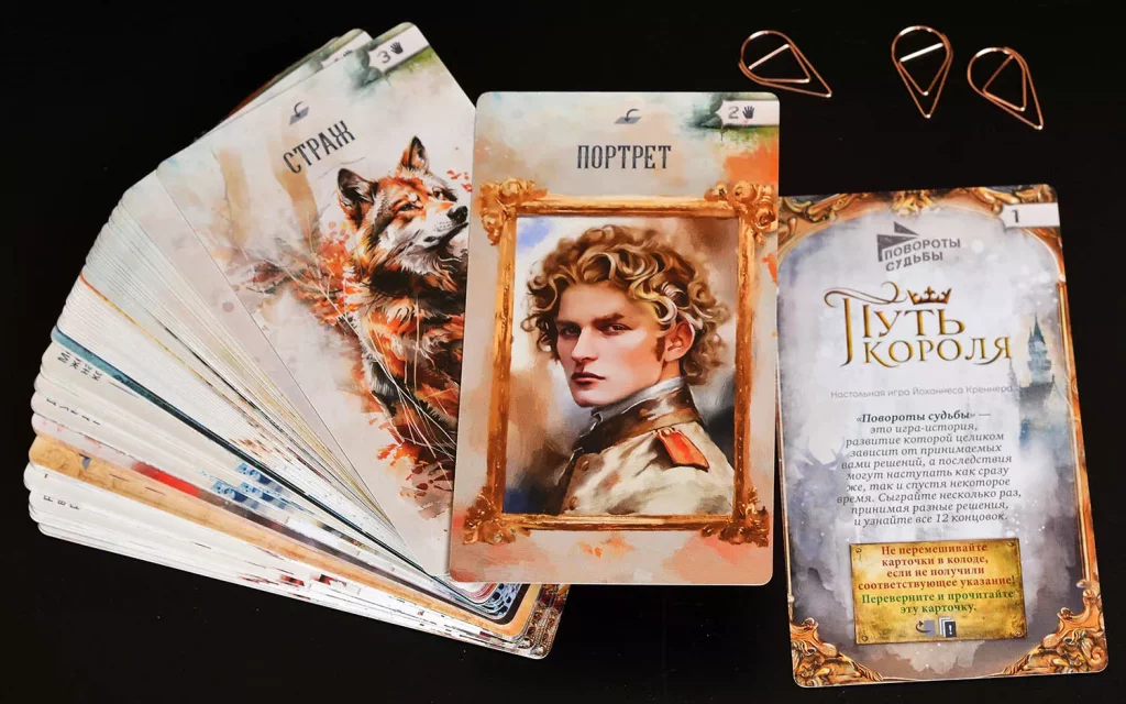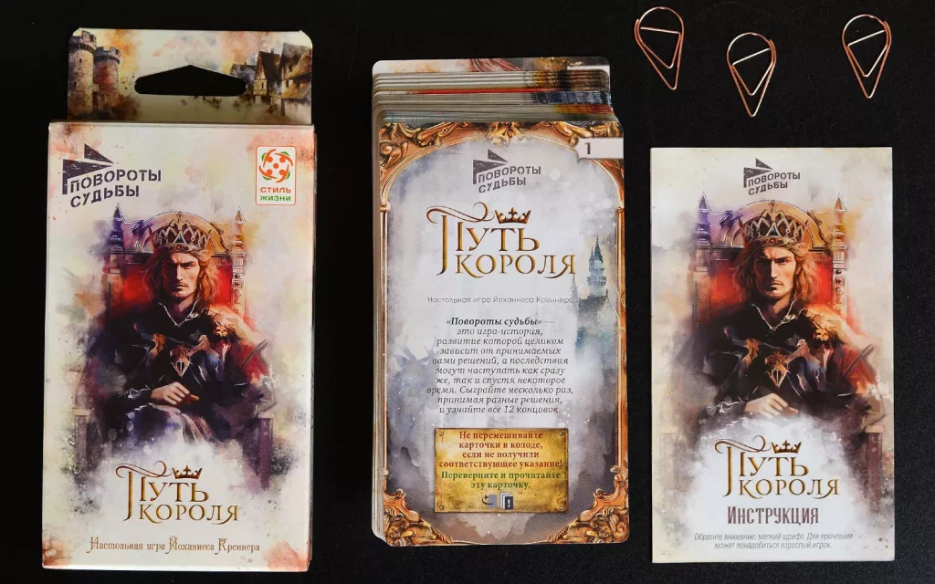 «Повороты судьбы: Путь короля» рассчитана прежде всего на одного игрока, рекомендованный возраст — от 14 лет, а средняя партия занимает около 45 минут. Правила несложные, акцент сделан на чтении и выборе, поэтому игра напомнит интерактивный роман или игру-книгу, но в более компактном, карточном формате. Благодаря атмосферным иллюстрациям в технике акварели и продуманной подаче текста вы легко погружаетесь в мир средневекового королевства, где от одних и тех же ситуаций можно прийти к очень разным судьбам.​