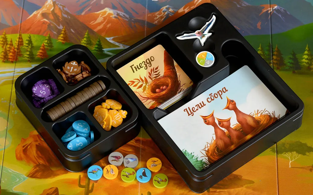 Корм представлен жетонами разных типов – насекомые, семена, рыба и другие виды провизии, характерные для конкретных биомов. Собирая эти жетоны, вы не просто пополняете запас пищи, но и формируете наборы, необходимые для кормления птенцов и выполнения целей. На личном планшете каждый игрок размещает сегменты биомов и собранные жетоны так, чтобы закрывать условия карт целей и получать за это победные очки.
