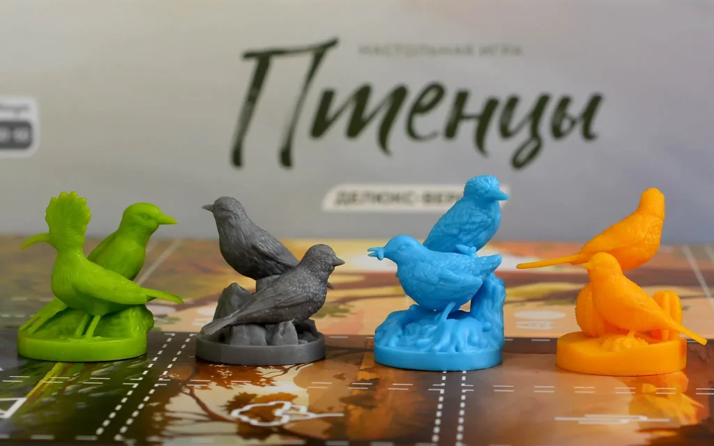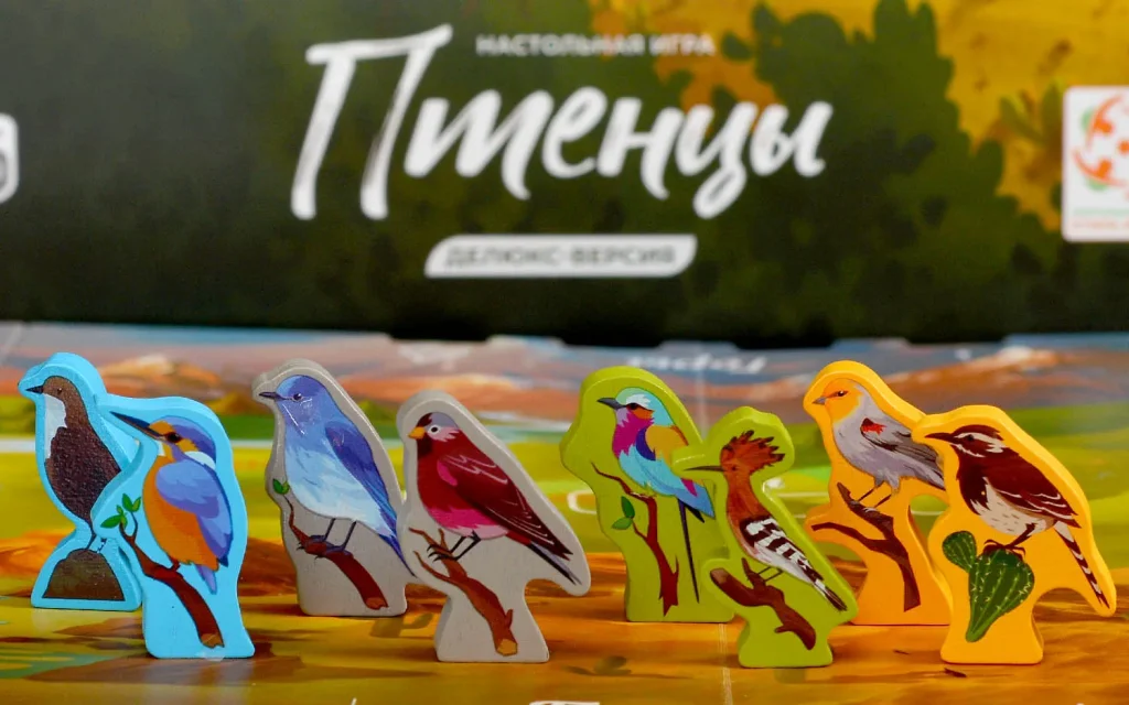 Делюкс-версия «Птенцов» отличается улучшенными компонентами. В комплект входят 3D‑фигурки птиц, дополнительно к деревянным миплам, шесть пластиковых органайзеров, удобный лоток для броска кубиков и увеличенное количество жетонов и аксессуаров, делающих игру более наглядной и приятной на столе. За счёт объёмных фигурок и множества цветных сегментов биомов поле в конце партии выглядит как яркая карта экосистем с живыми птицами и богатым кормом.