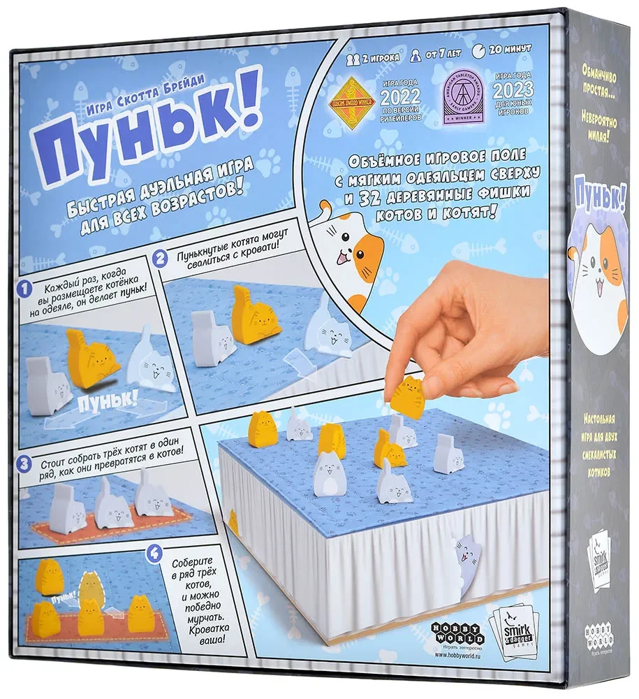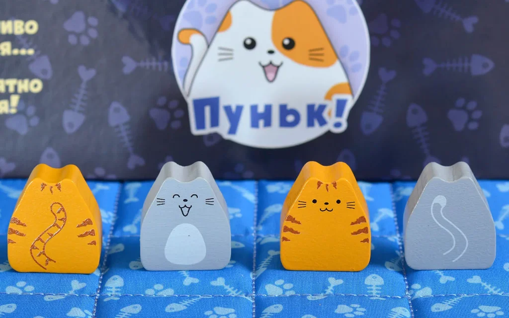 «Пуньк!» – очаровательная дуэльная настольная игра, в которой два игрока сражаются за мягкую кровать, усыпанную котятами и котами. Игровое поле оформлено в виде стёганого одеяла, а вместо привычных абстрактных фишек здесь – милые фигурки пушистых хвостатых. Ваша цель проста и забавна: первым выстроить ряд из трёх взрослых котов или разместить на одеяле всех своих котов одновременно, превратив кровать в личный кошачий трон.
