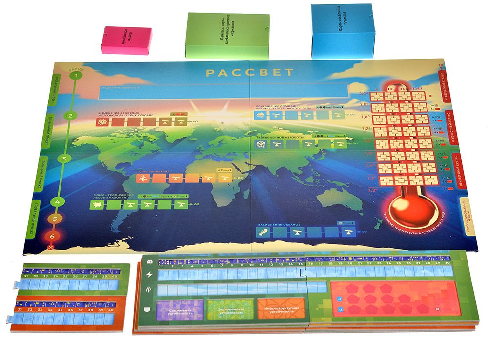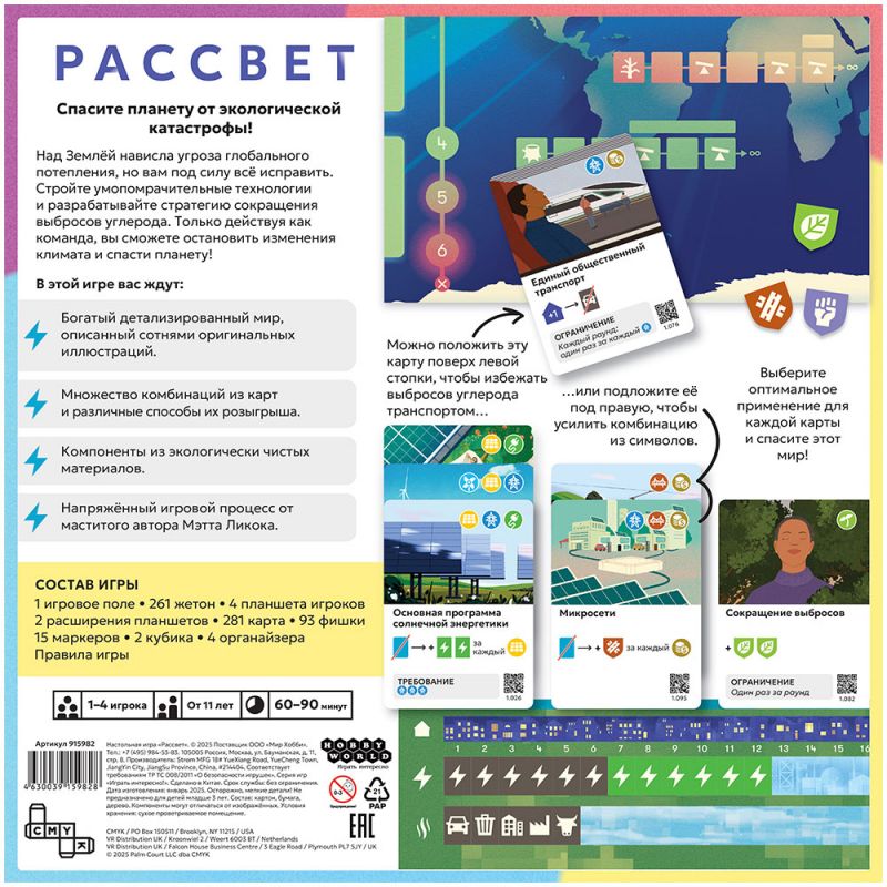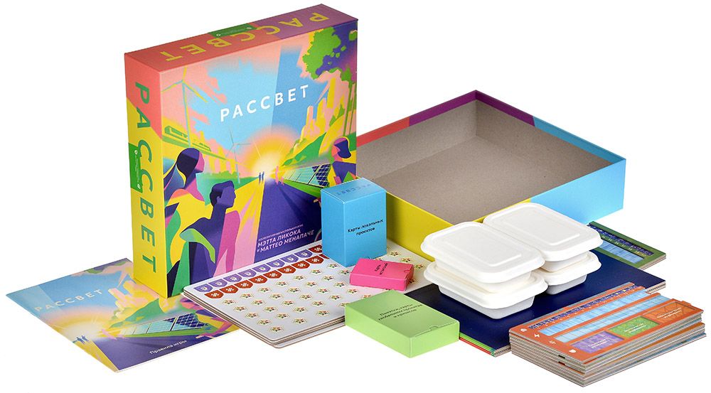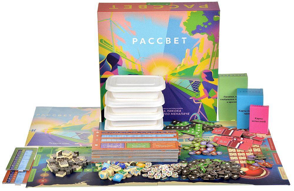 «Рассвет» выделяется экологически чистыми материалами: переработанная бумага, нетоксичные краски и продуманный органайзер для хранения. Богатые иллюстрации сотен карт погружают в детализированный мир современных климатических технологий и последствий потепления. Дизайн подчёркивает серьёзность темы, но сохраняет доступность: правила осваиваются за 10–15 минут, а соло‑режим позволяет одному игроку проверить силы против автоматизированных кризисов.