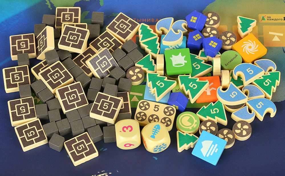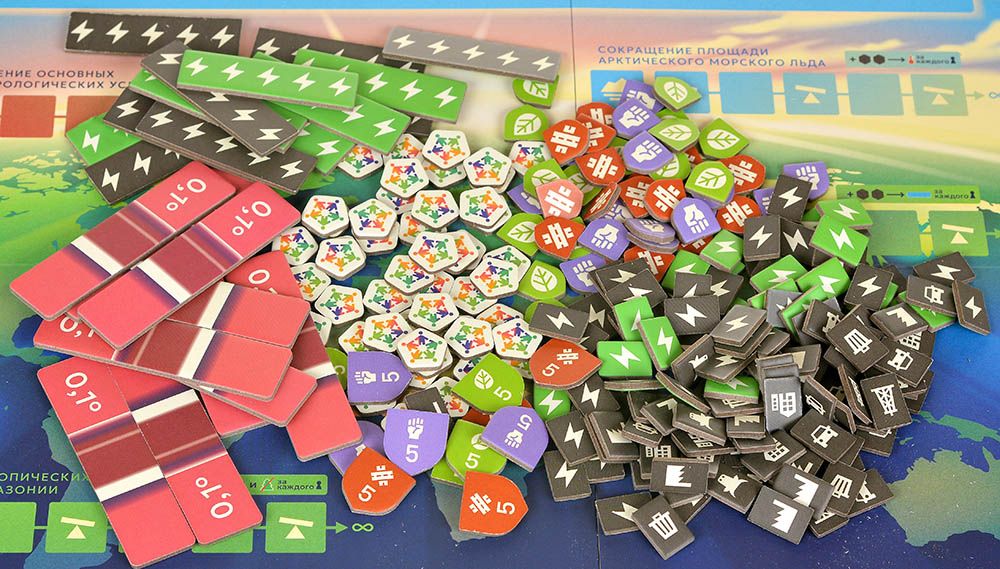 Ресурсы в игре представлены жетонами: углеродные блоки (которые нужно убирать), энергия, деньги и специальные фишки проектов. Игроки собирают их через базовые действия (производство, торговля, исследования) и тратят на амбициозные инициативы. Два кубика используются для случайных событий или генерации ресурсов, добавляя лёгкую вариативность без чрезмерной случайности.