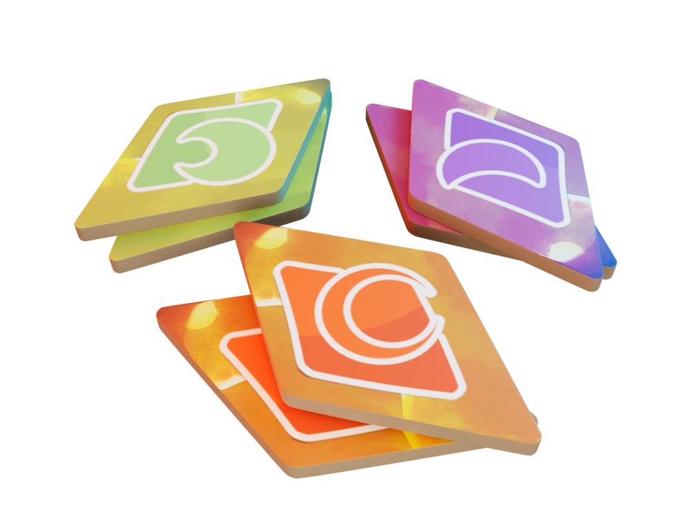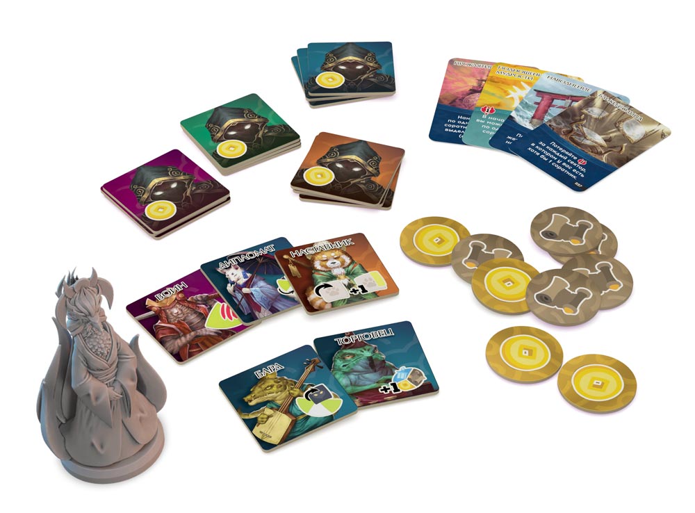 Ход строится вокруг действий: размещение соратников (80 тайлов), сбор осколков луны (36 жетонов), выполнение сценариев (12 карт). Уникальные клановые фишки дают преимущества: один клан усиливает торговлю, другой — исследования. Вращение поля меняет доступность зон, заставляя адаптироваться. Карты секторов (12 шт.) и поворотов (3 карты) добавляют вариации, а жетоны благосклонности отслеживают прогресс.