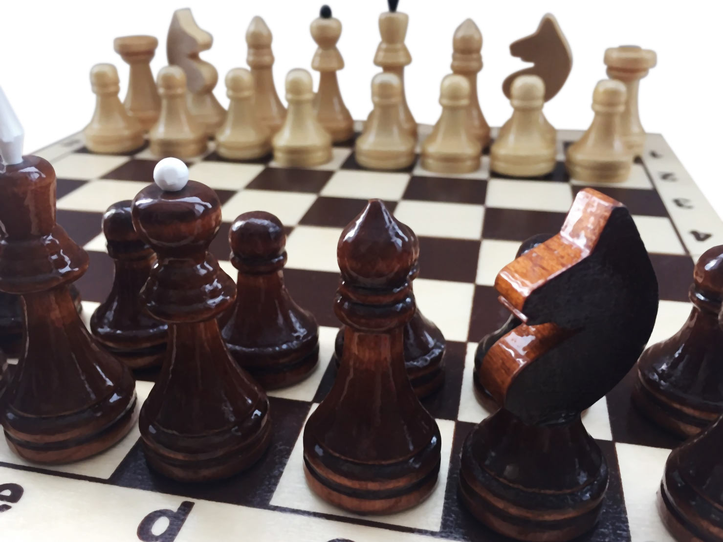 Фигуры выполнены из лиственных пород дерева и покрыты защитным лаком, что придаёт им благородный внешний вид и делает более устойчивыми к износу. Высота фигур варьируется от примерно 57 мм у пешки до 110–113 мм у короля, благодаря чему позиции на доске отлично читаются даже на расстоянии. Лаковая обработка доски и фигур защищает дерево от влаги и мелких повреждений, продлевая срок службы набора при аккуратном использовании.