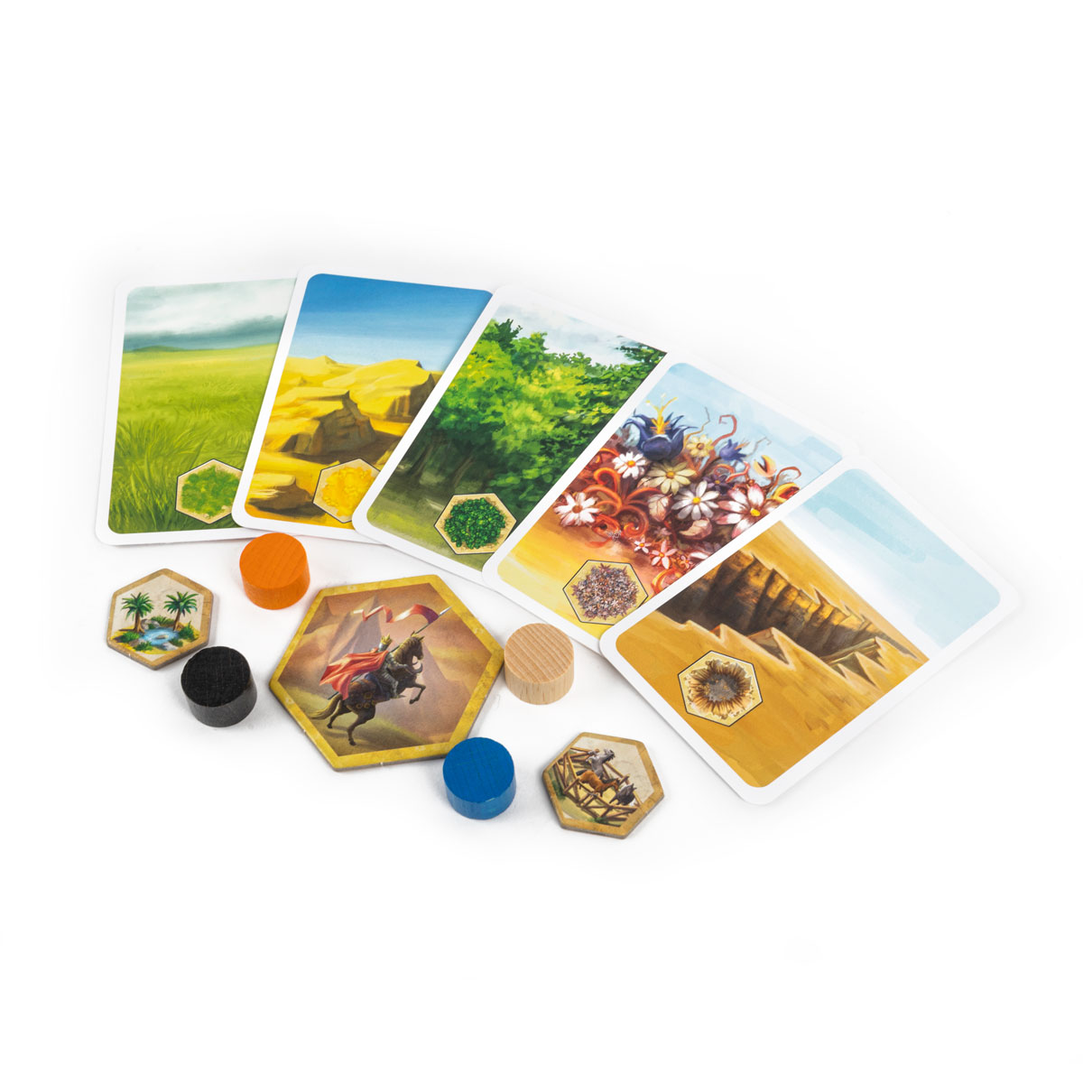 Поле в «Строителях королевств» всегда собирается по‑новому: используется набор из восьми двухсторонних фрагментов, из которых выбираются четыре и формируется карта мира. На гексагональных клетках представлены разные виды местности – степи, леса, пустыня, цветочные поля, каньоны и луга, а также специальные локации с дополнительными действиями и замки. Благодаря модульности каждая партия получает свой «ландшафт», а вместе с ним и новые тактические задачи: где выгоднее строиться, какие локации контролировать и какие области оставить на потом.