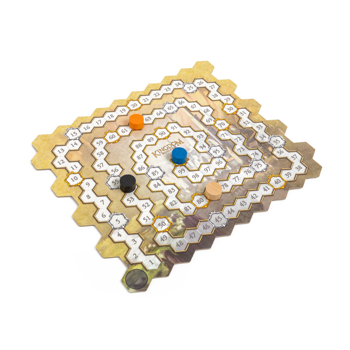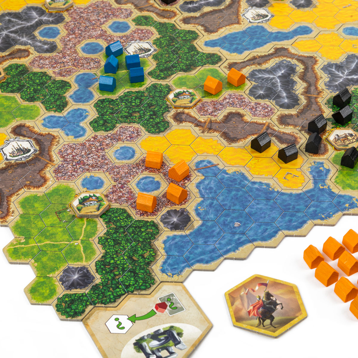 Каждая партия проходит под влиянием трёх карт королевств – целей, случайно выбранных из десяти. Они определяют, за что именно игроки будут получать золото: за большие связные области поселений, за домики рядом с водой, за присутствие в разных секторах поля или за контроль вокруг замков. Эти условия побуждают выстраивать совершенно разные стратегии от партии к партии: иногда вы тянетесь к краям карты, иногда – стремитесь объединить всё в один мощный кластер или, наоборот, рассыпать поселения по всему полю.