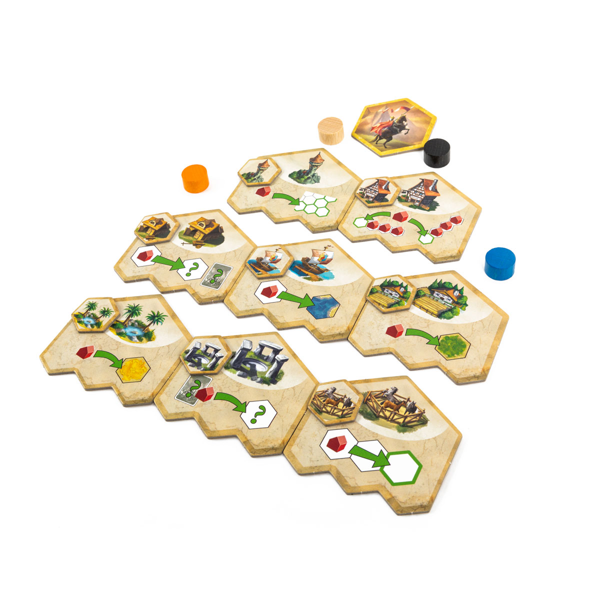 28 жетонов локаций – открывают особые действия: дополнительное строительство, перемещение поселений, игнорирование правила соседства и другие эффекты.
