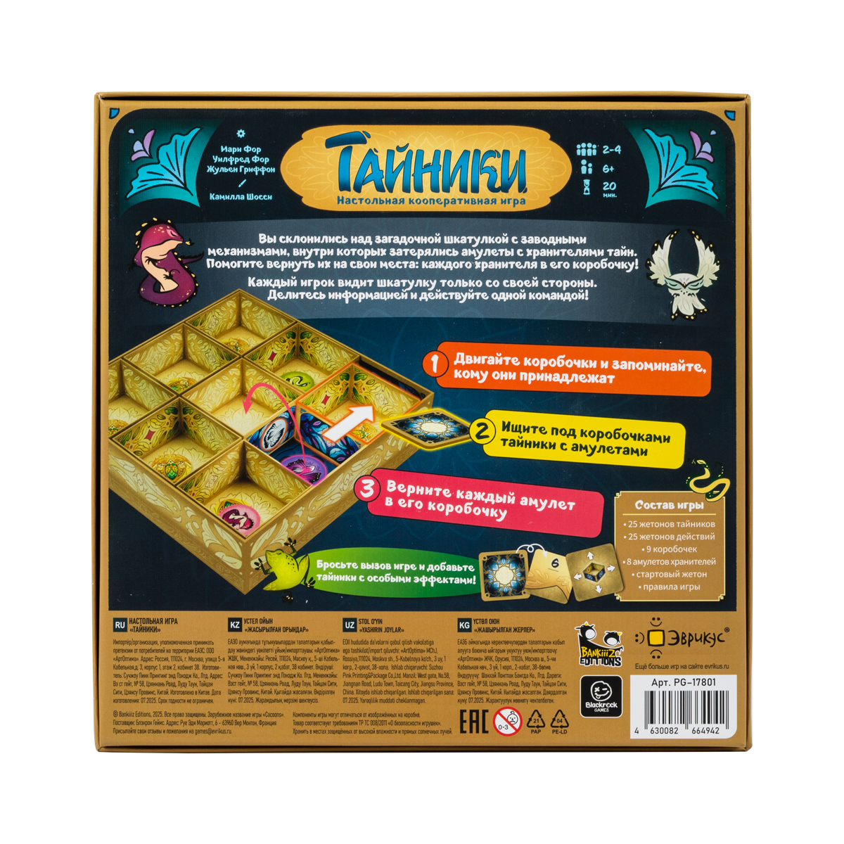 «Тайники» — это кооперативная настольная игра‑головоломка, в которой обычная на вид шкатулка превращается в многоуровневый логический вызов для всей семьи. Внутри неё спрятаны маленькие коробочки с заводными механизмами, амулеты с хранителями тайн и стартовый жетон, который ещё предстоит отыскать. Игрокам нужно не только разобраться, что где лежит, но и скоординироваться друг с другом, чтобы за ограниченное количество ходов вернуть всех хранителей в их тайники и успеть открыть стартовый жетон.