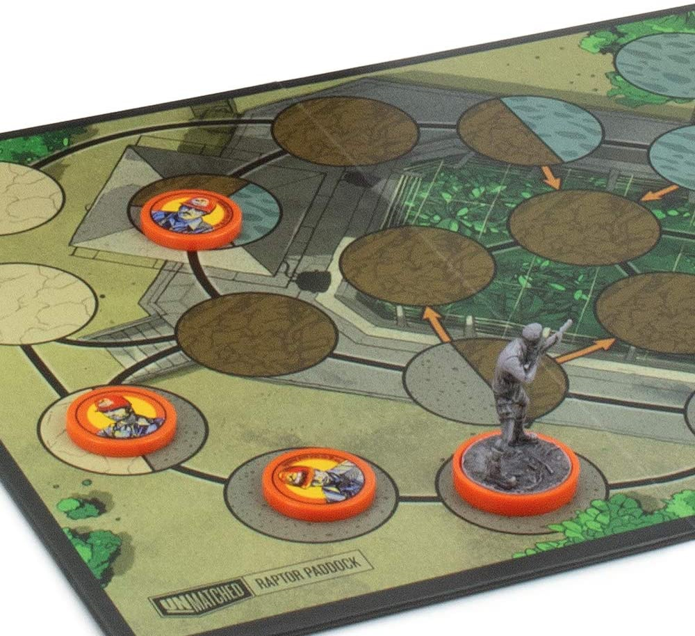 Добро пожаловать в Парк Юрского периода! Человек здесь больше не венец природы, а решётки вовсе не так надёжно сдерживают древних ящеров. Компания InGen встречает своих противников на поле «Загон рапторов». Некоторые ячейки на нём соединены не привычными чёрными линиями, а оранжевыми стрелками. Такие ячейки всё ещё считаются смежными и никак не влияют на атаки, но бойцы могут перемещаться по ним только в одном направлении — по стрелке. Огромные герои — например, Ти-рекс из набора Dr. Sattler vs T.Rex — могут передвигаться в обоих направлениях, взбираясь на препятствие или проламывая себе путь через джунгли.