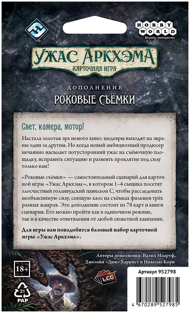 При этом важно помнить, что «Роковые съёмки» не являются самостоятельной игрой. Для использования всех компонентов вам потребуется базовый набор «Ужас Аркхэма. Карточная игра», предоставляющий сыщиков, жетоны, базовые карты и основной набор правил. Новичкам сценарий подойдёт как яркий однократный опыт после освоения базы, а опытным игрокам — как атмосферная «интерлюдия» между крупными циклами или возможность попробовать новый сеттинг и испытать привычные колоды в необычных условиях.