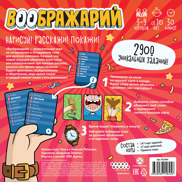 По сути «Воображарий» — это универсальный «генератор» историй, мимики и импровизации. В начале хода новый ведущий смотрит на верхнюю карту заданий и видит в ячейке два слова, например «дырокол» и «светофор». Игрок сам решает, какое из них будет объяснять, и этим выбором задаёт тон всей минутной мини‑сценки, которую увидят остальные.​