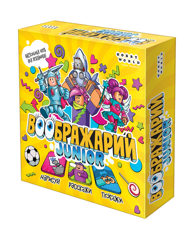 «Воображарий: Junior» — детская версия популярной игры на ассоциации, созданная специально для игроков примерно от 6 до 10 лет. В ней дети по очереди становятся ведущими и объясняют другим слова или короткие словосочетания, а остальные стараются как можно быстрее их отгадать. Всё строится на воображении, умении подбирать ассоциации и слышать друг друга, поэтому игра отлично развивает речь, креативность и уверенность в общении.​